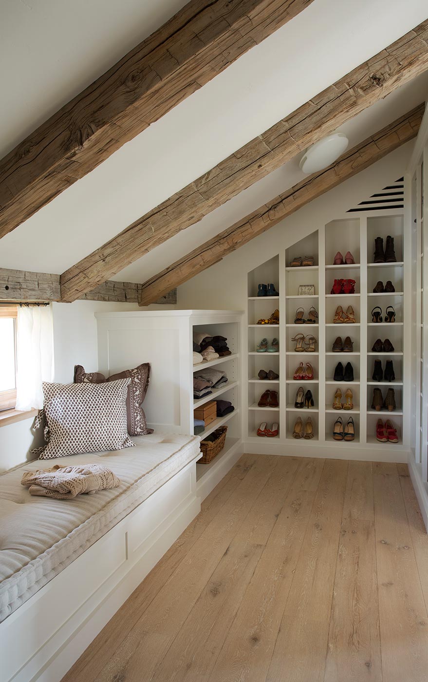 Дизайнеры предлагают множество идей, позволяющих задействовать под системы хранения обуви самые укромные уголки дома. Любая асимметрия пространства будет диктовать нестандартную геометрию шкафа, форму и степень наклона полок. Так, неплохим местом хранения может стать, к примеру, мансарда, где в месте наибольшего скоса потолка логично будет встроить емкий обувной шкаф.
