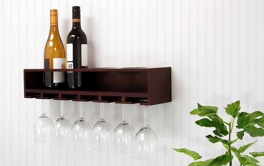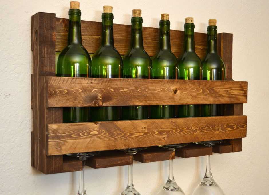 Затем деревянную поверхность следует зачистить, покрыть лаком в несколько слоев или выкрасить в подходящий к интерьеру цвет. Осталось повесить полку в затемненное место и разместить на ней несколько любимых бутылок, ждущих подходящего случая для того, чтобы насладиться восхитительным вкусом и ароматом.