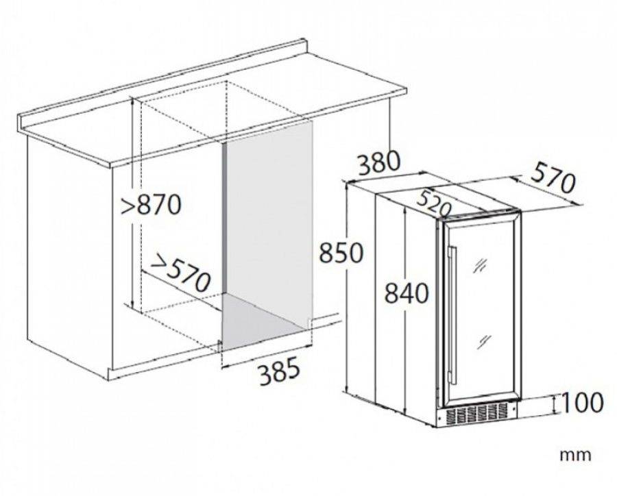 Стандартные габариты составляют 100–180 см в высоту, в ширину — 60–120 см. Длина отдельно стоящих моделей — примерно 35–60 см. Встраиваемые конструкции и шкафы винные под столешницу зачастую обладают меньшими размерами. Примерные габариты этих изделий: высота — 90 см, ширина — 60 см, длина — 30 см.