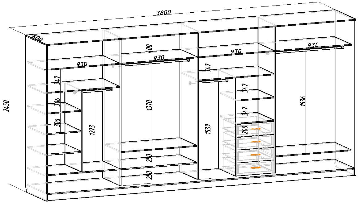 - ширина шкафа также ограничена размером листа ДСП. Для ее увеличения на чертеж добавляются перегородки. В этом случае готовая конструкция будет состоять из двух и более модулей;