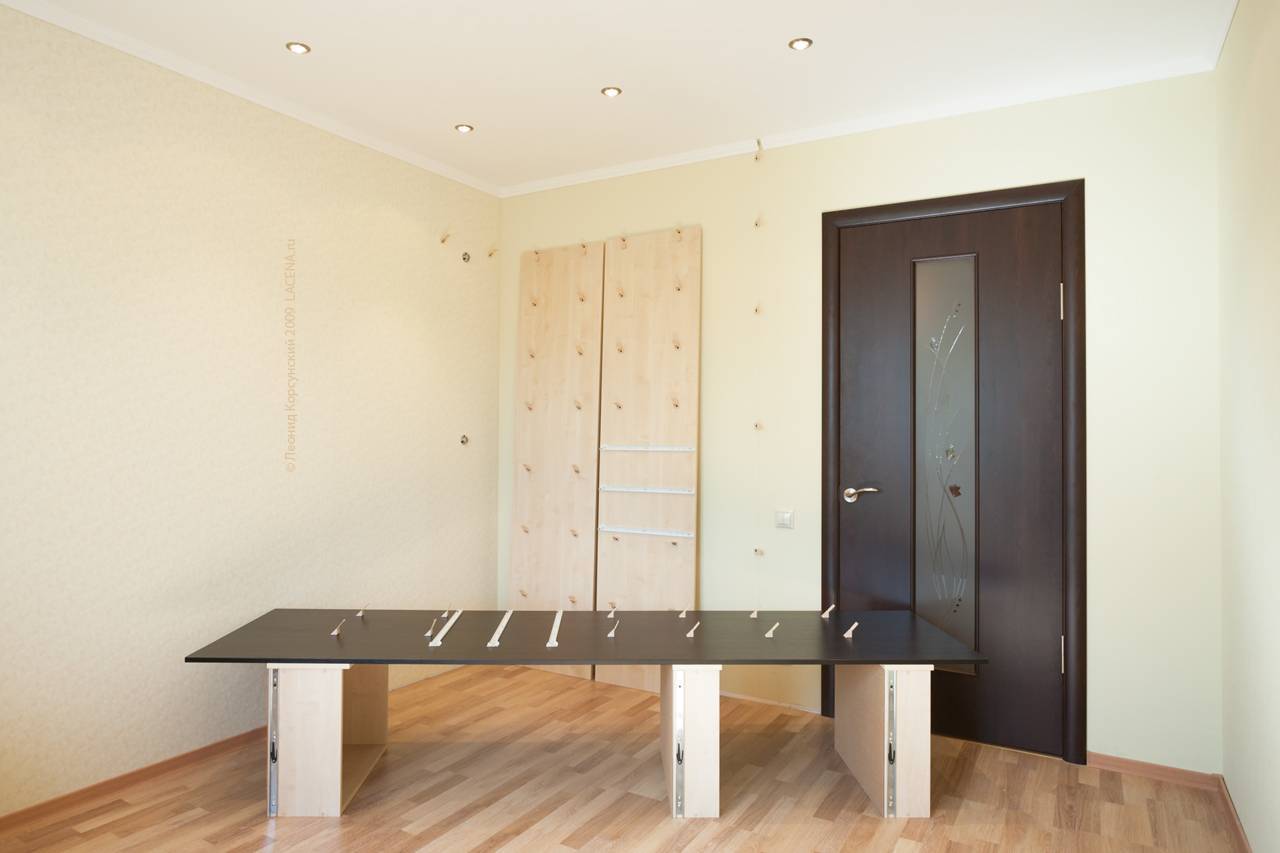 У такого проекта будут отсутствовать боковая стенка, пол или верхнее наполнение. Это позволит уменьшить объем комплектации, размеры и существенно снизить стоимость. Но следует понимать, что при этом будут задействованы стены, в которые придется монтировать крепления.