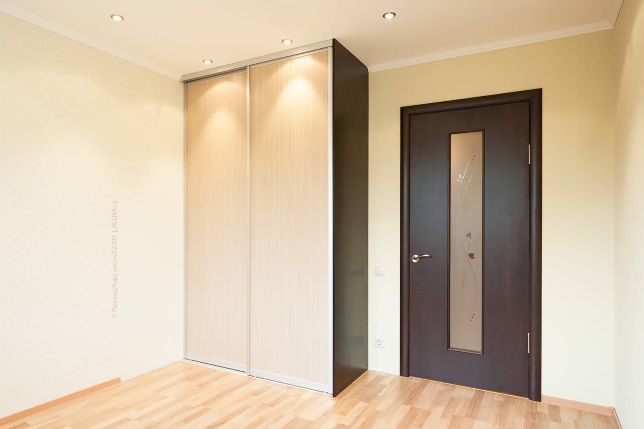 Также часто делают шкаф рядом с входом. В таком случае, не стоит забывать о ширине наличника двери, а так же о возможных выключателях и розетках, которые тоже любят размещать рядом с входом, все это, повлияет на итоговую глубину, либо длину шкафа-купе.