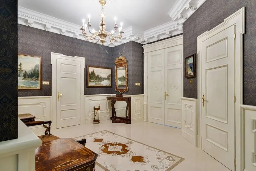В интерьере классической прихожей в доме применяют более богатую отделку, дорогой шелковый или бархатный текстиль, позолоченные элементы, лепнину и антикварный декор, позволяющий придать обстановке дворцовый облик.