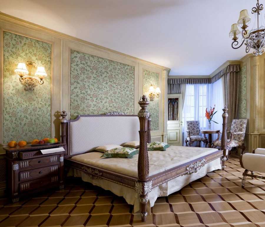 Чтобы придать интерьеру спальни кантри целостность, особое внимание следует уделить полу. Главными критериями должны быть комфорт и натуральность.. Идеальным вариантом будет дубовая доска, но также интересно выглядят комбинированные полы из разных пород дерева