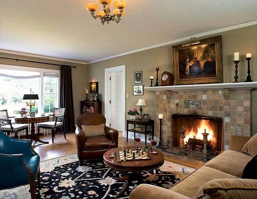 Для создания выразительных эффектов в американском интерьере используют приглушенные оттенки. Неяркий песочный встречается в орнаменте на ковре, обивке мягкой мебели и во фрагментах на стенах. Размытый серый и разбавленный оливковый помогут визуально сделать комнату теплее или холоднее.