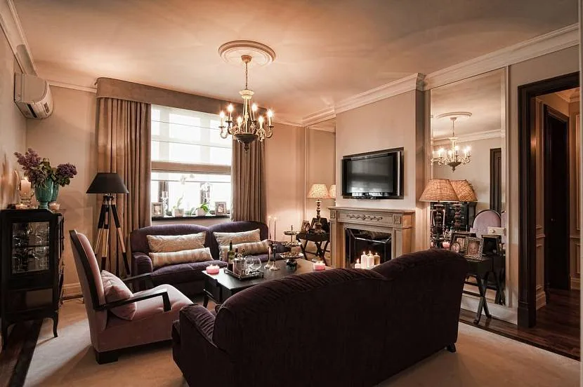 Если шкаф расположен напротив диванной группы, то внутри можно разместить стенку с телевизором. Это хорошее решение для гостиных в стилях ампир, барокко, классицизм, модерн. Современную технику с минималистичным дизайном очень сложно вписать в такие интерьеры, поэтому ее прячут за раздвижными створками.