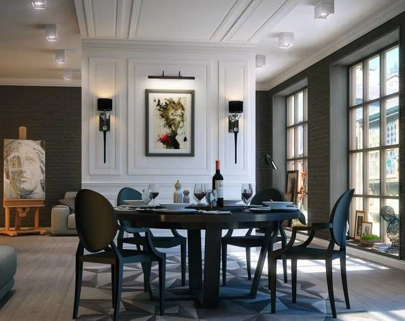 Чтобы выделить отдельные элементы дизайна, применяют насыщенную гамму. Шоколадный цвет придает оформлению рельефности и глубины. Он встречается на балках потолка, в рисунках на шторах или в резьбе на мебели. Американская классика в интерьере заиграет свежими нотами с черным или графитовым геометрическим орнаментом на светлом фоне.