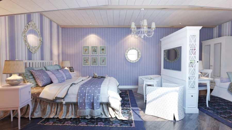 Отличным решением для дизайна стен спальни кантри будут деревянные панели, искусственно состаренная фактурная штукатурка, текстильные обои или их имитация. Также подойдет густая фактурная краска, дающая глубокий цвет. Ее можно нанести как на гладкие стены, так и поверх декоративной штукатурки.
