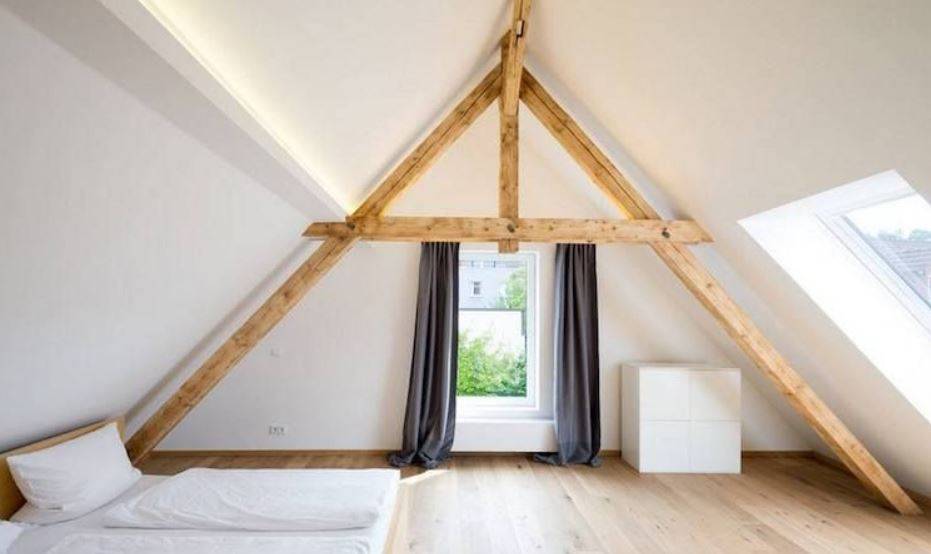 Такой дизайн приобретет по-настоящему естественный и гармоничный вид, за счет деревянных балок на потолке и напольного покрытия, обладающего натуральным оттенком. Благодаря возможности наличия нескольких окон в крыше, мансардная спальня наполниться большим количеством света.