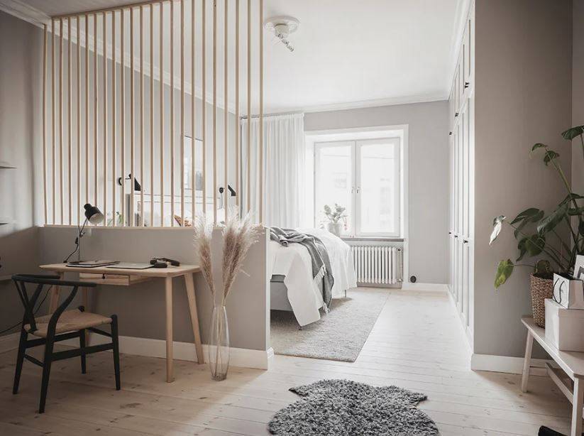 Дизайн помещения осуществляется в светлой гамме с применением минимального количества аксессуаров. В спальне-гостиной для зонирования устанавливают тканевые ширмы, прозрачные перегородки или сквозные стеллажи.