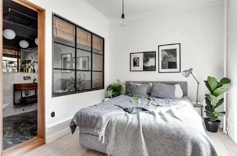 На фото спальня-гостиная в скандинавском стиле с металлической перегородкой со стеклянными вставками.