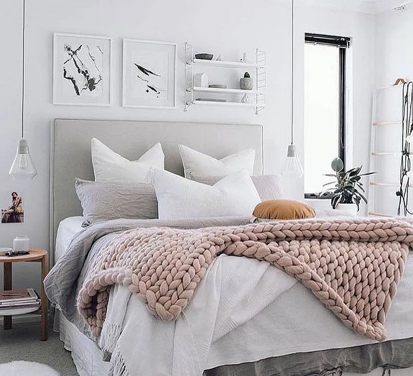 Именно текстиль отличает скандинавский стиль в интерьере спальни. Для этого направления характерны изделия из натуральных тканей – льна, хлопка, шерсти.