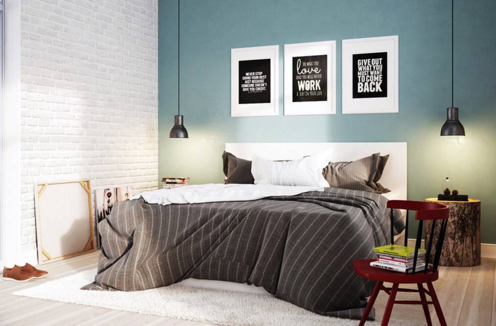 На следующем примере видно, как гармонично сочетаются урбанистические элементы со скандинавской простотой. На фоне белой кирпичной стены отлично смотрится простая серая кровать, однотонные подушки и зелень комнатных растений.