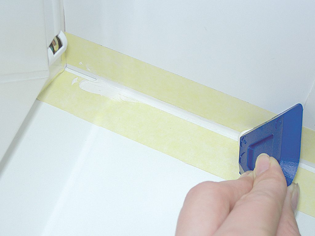 Для того чтобы облегчить себе задачу можно использовать малярный скотч, которые необходимо приклеить по обе стороны от будущего шва, оставив между ними полоску свободного пространства. После того как герметик будете нанесен, необходимо просто удалить скотч. Перед тем, как наклеить скотч, необходимо точно знать, какой толщины должен быть шов. А при нанесении следить, чтобы длинна шва герметика, не превышала, длинны наклеенных полосок скотча.