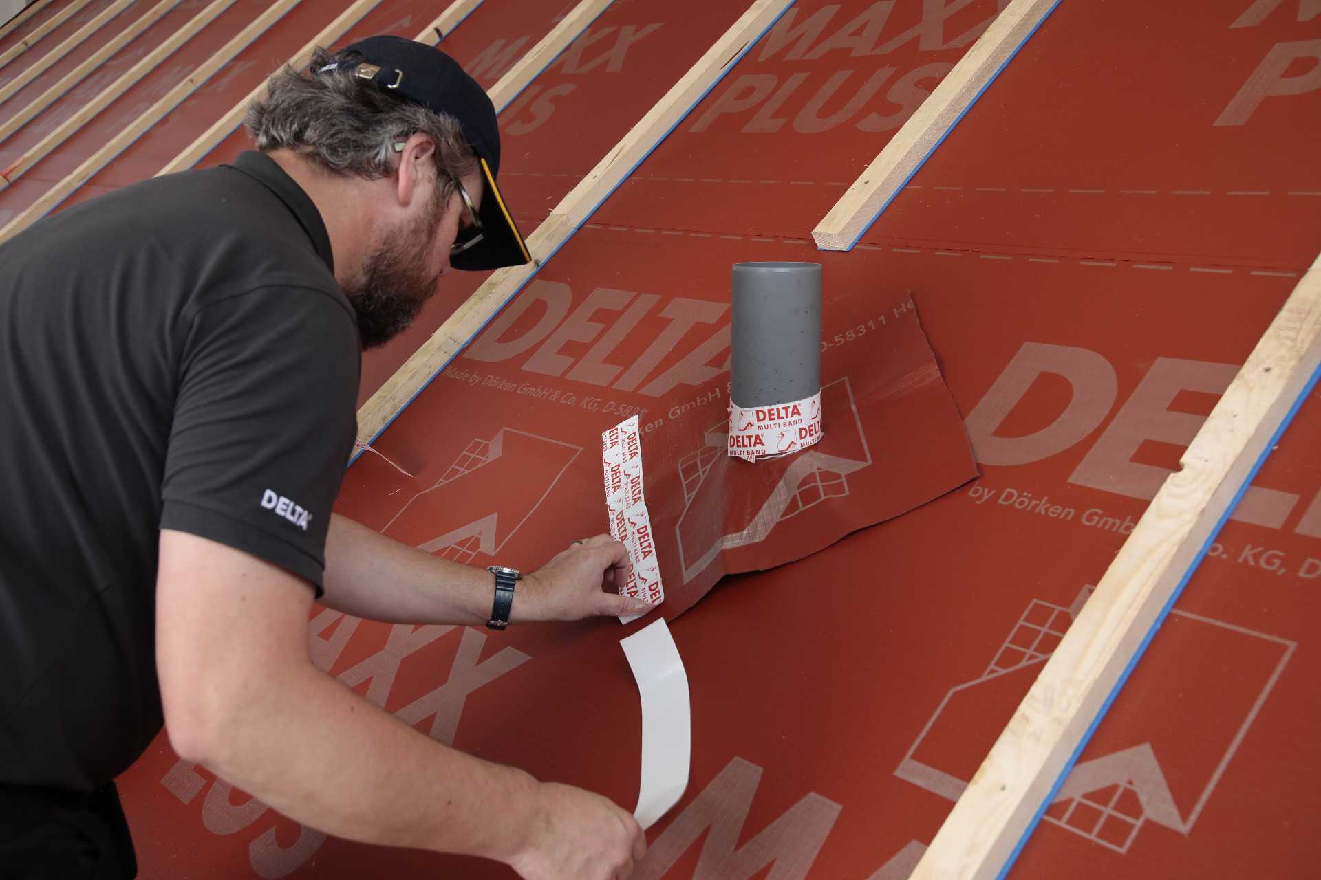 4. Специальный скотч D-TACK Tacoflex предназначен для создания пароизоляционного контура и применяется для герметизации проходок — вентиляционных труб, клеится внахлест. Ширина 50мм.