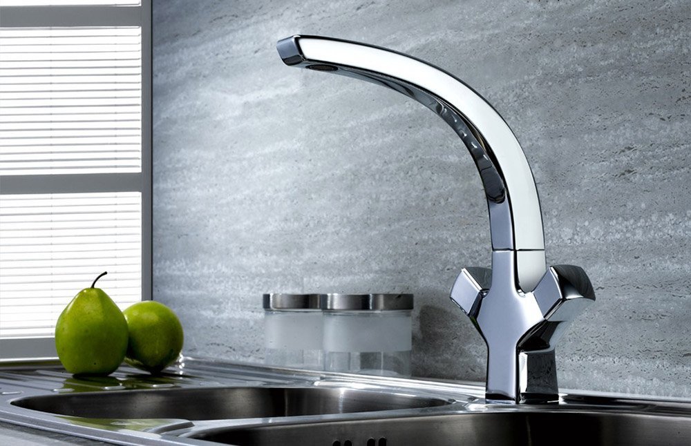Для кухни подойдёт простой вариант с двумя кранами и загнутым краном. Для ванной, если ванна стоит отдельно от раковины, подойдёт отдельная модель в душ и отдельная для умывальника.