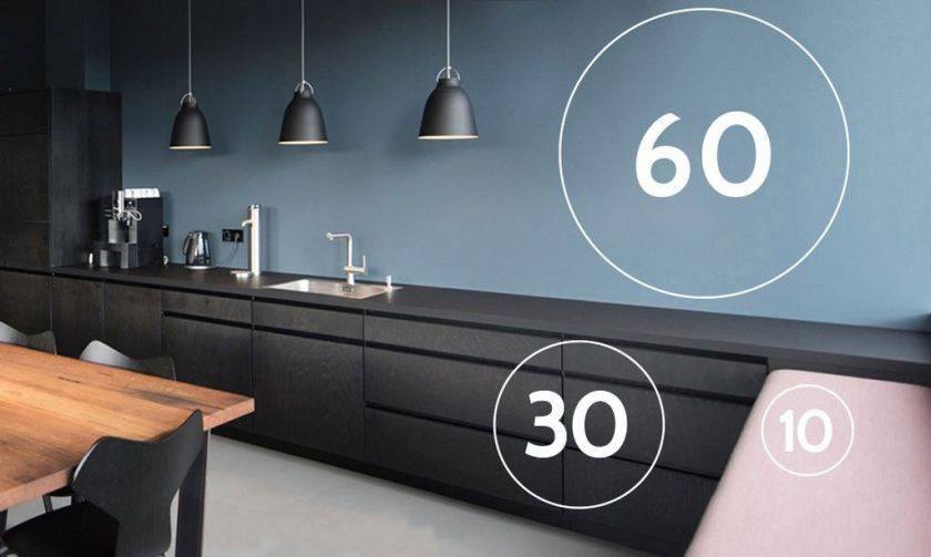 Если при обустройстве интерьера задействуется 3 цвета, их нужно комбинировать, руководствуясь правилом 60-30-10. Это процентное соотношение каждого из трех цветов выбранной палитры. Расшифровка цифр:
