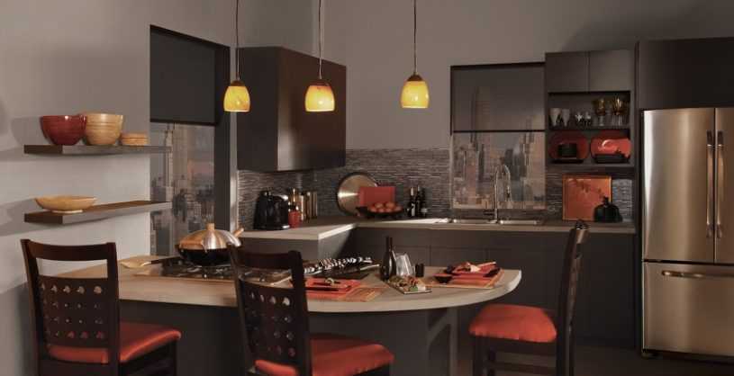 Помещение в оранжевой гамме нужно правильно осветить, иначе потеряется красота оформления. Точечные светильники по периметру потолка дополнены центральной люстрой. Если комната большая, то осветительные приборы помогут зонированию. Подвесы располагают в столовой, над рабочим островом достаточно спотов на треке.