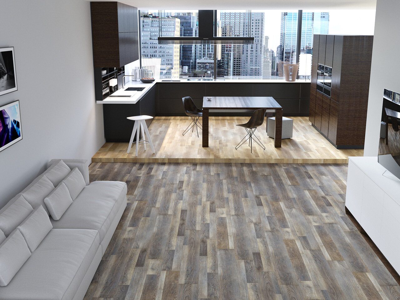 - дверь несложно подобрать под цвет пола. Но покрытие не должно быть выполнено в светлых и агрессивных тонах. Это не позволит выделить из всего стены и мебель. Если хочется получить тёплые полы, то необходимо выбрать тёплый оттенок. Стоит помнить, что подсознание человека также влияет на оценку не только визуальною, но и внутреннего комфорта и уюта. Например, на фото прекрасно видно удачное сочетание серого пола и выбеленного дуба в дверном полотне;
