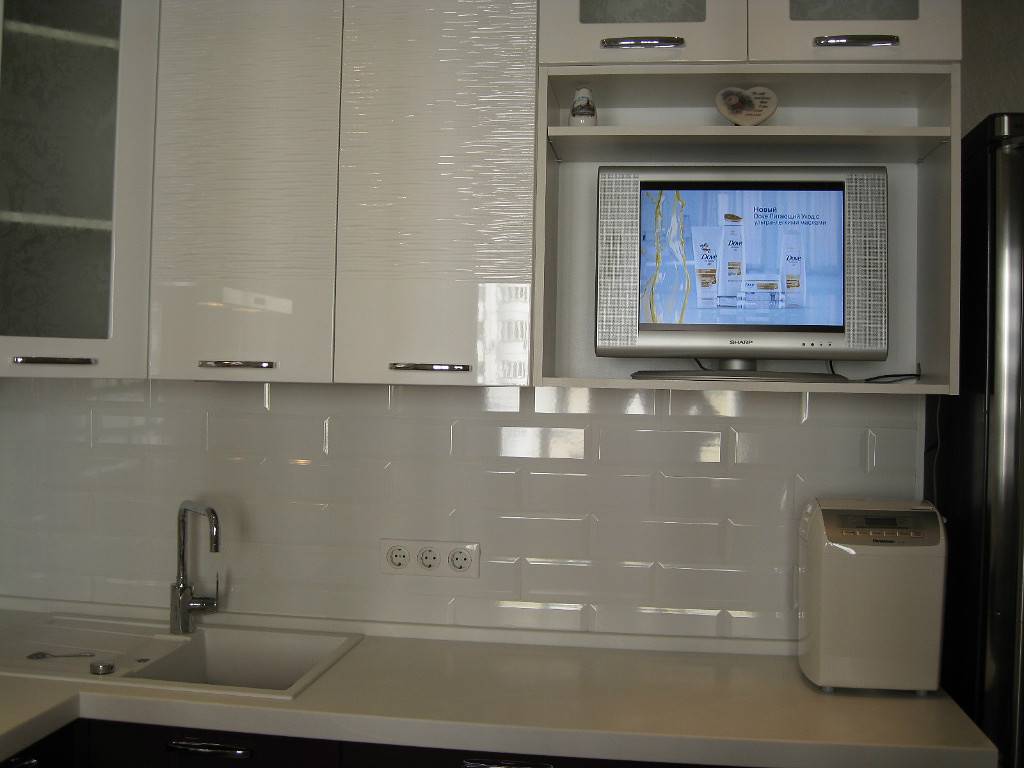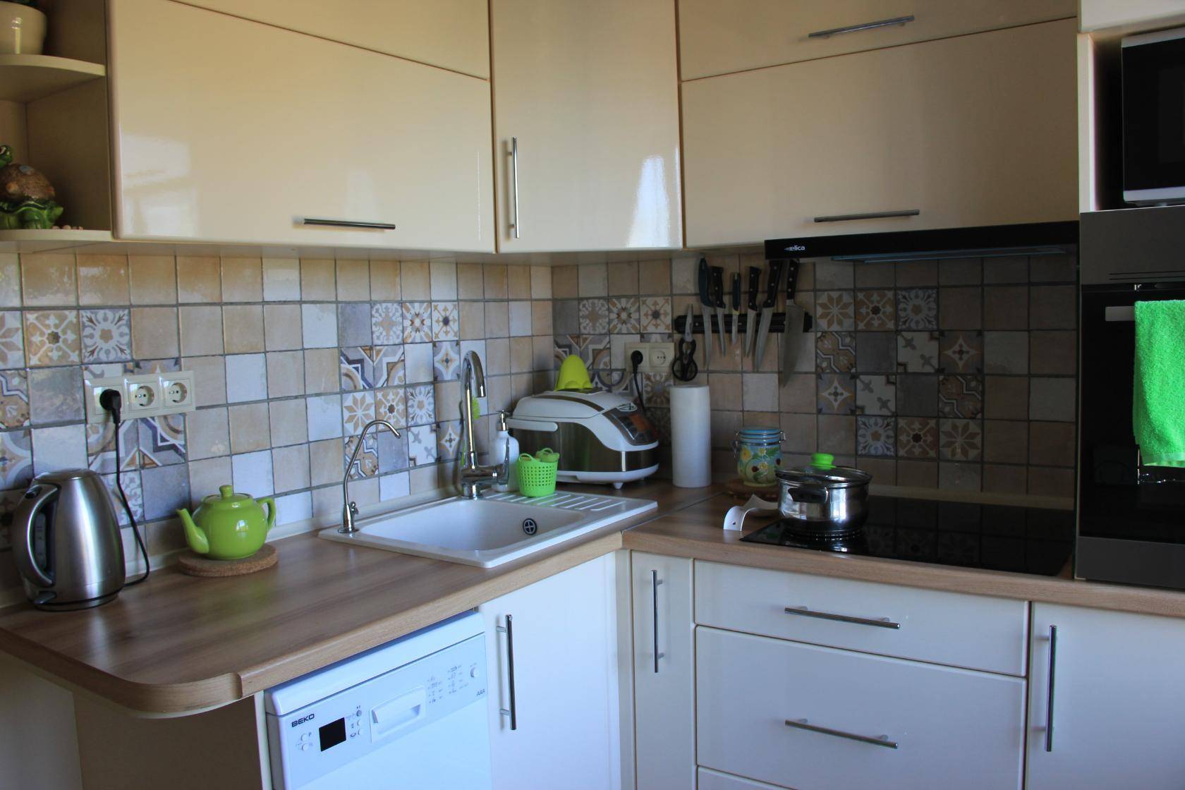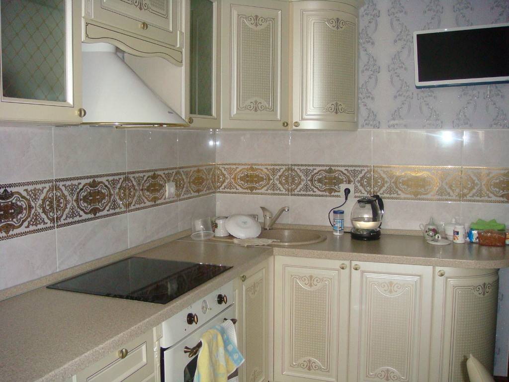 Например, матовые гладкие или лаконичной фрезеровки фасады – глянцевая прямоугольная плитка (“кабанчик”, квадратная плитка 10х10, скромная мозаика).