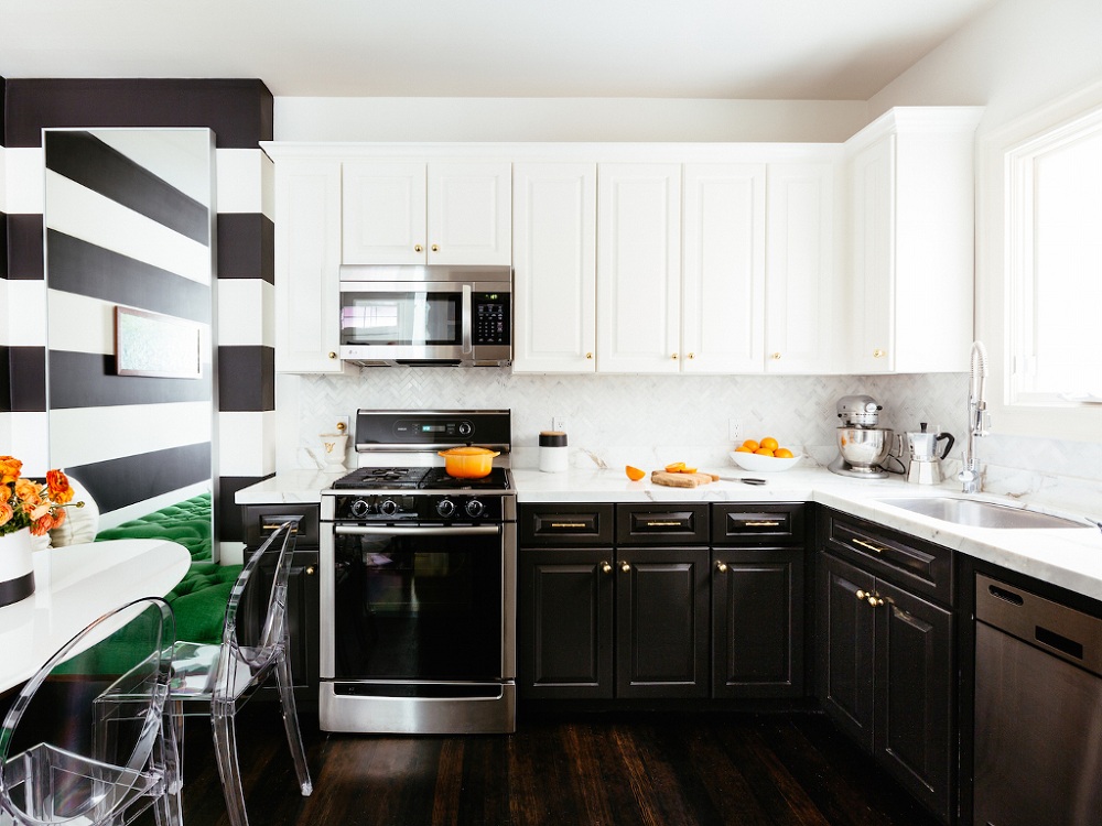 - Белый верх и черный низ. Хорошее решение для любой по площади кухни. Этот метод позволяет выполнить четкое разграничение пространства. Крупная бытовая техника сливается с ящиками, тумбочками, становится более приземленной, в то же время верхняя часть выглядит воздушно.