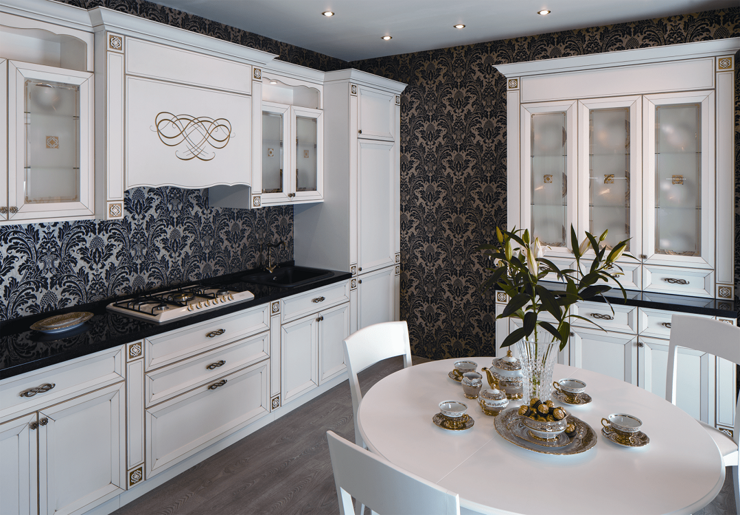 - Белая кухня и черный стол. Отдельный элемент кухонной мебели будет хорошо сочетаться среди светлой окраски. Может выступать в качестве акцента, поддерживать другие элементы. Отличный вариант для оформления интерьера в стиле прованс или классик.
