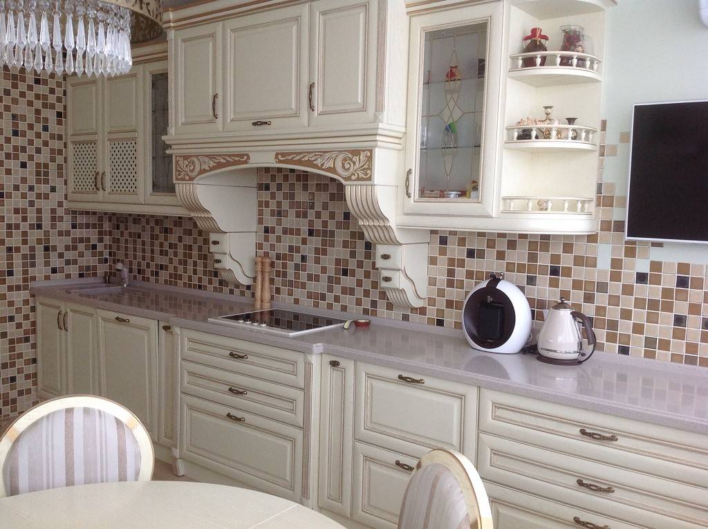 - бежевые фасады в комбинировании с отделкой скинали, плиткой с бело-молочной расцветкой, бежево-коричневой мозаики, деревом;