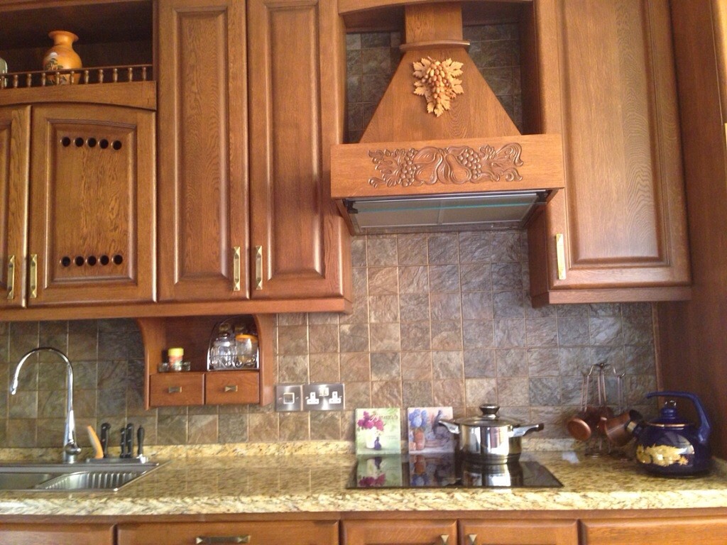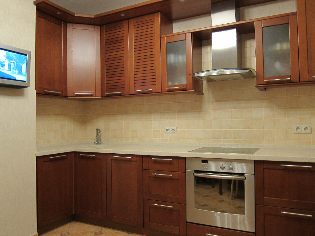 При желании область фартука можно поднять над вытяжкой. Если в районе рабочей зоны устроена ниша, то ее обязательно облицовывают.
