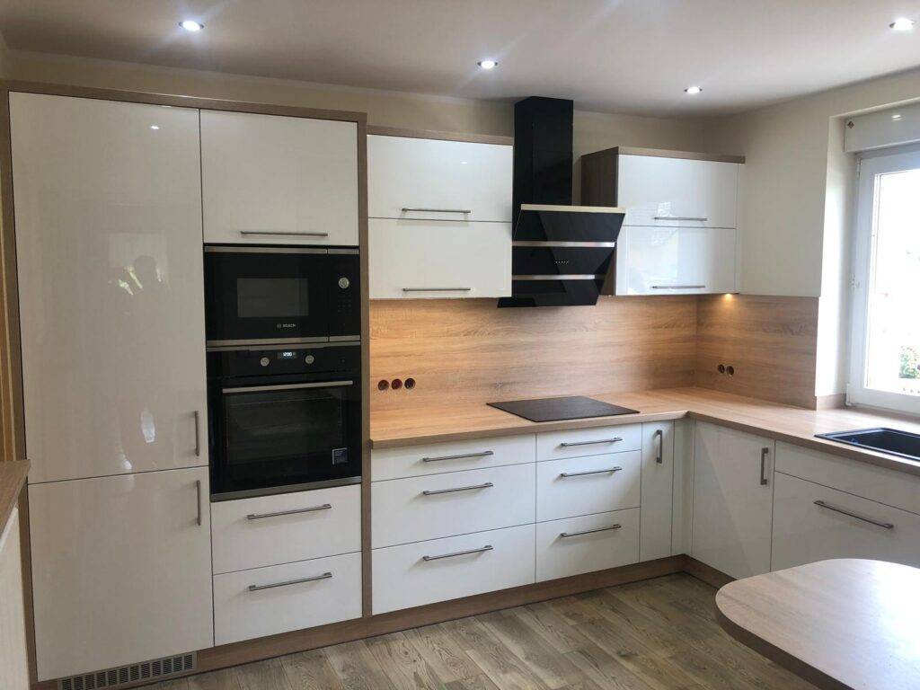 Дизайн белой кухни с коричневой столешницей – это чаще всего вариант с рабочей поверхностью из дерева.