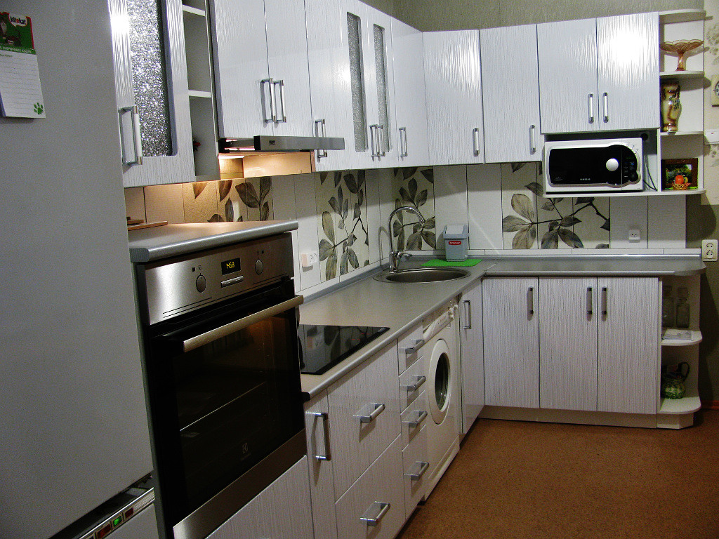 При оформлении нижней части комнаты в светлых тонах, техника должна иметь тот же оттенок. Черный цвет будет хорошо смотреться в связке с шахматным полом, или вместе с черным низом. Желательно совмещать тональность техники с мебелью, в которую она будет встроена.