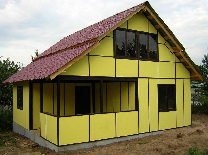 Если сравнивать этот вариант с каркасно-щитовым, то он обойдется дешевле. Собрать каркасно-панельную конструкцию при помощи небольших навыков и инструментов можно своими руками. Каркас производится из дерева и обшивается сэндвич-панелями.