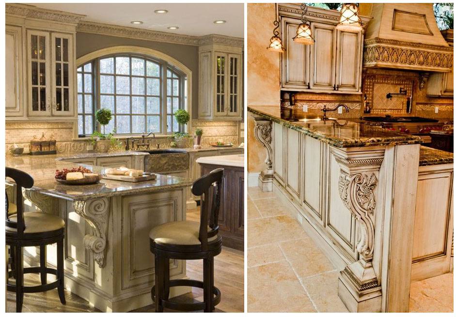 Шкафы часто оснащены специальными приспособлениями: для хранения посуды, для сушки тарелок, для декорирования вытяжки или газовой колонки, а также нишами для бытовой техники. Модульная мебель — это готовые секции определенного размера: есть тумбы со столешницами, комоды, шкафы под мойку, навесные открытые и закрытые полки с одной или двумя дверцами, угловые напольные и навесные модели.