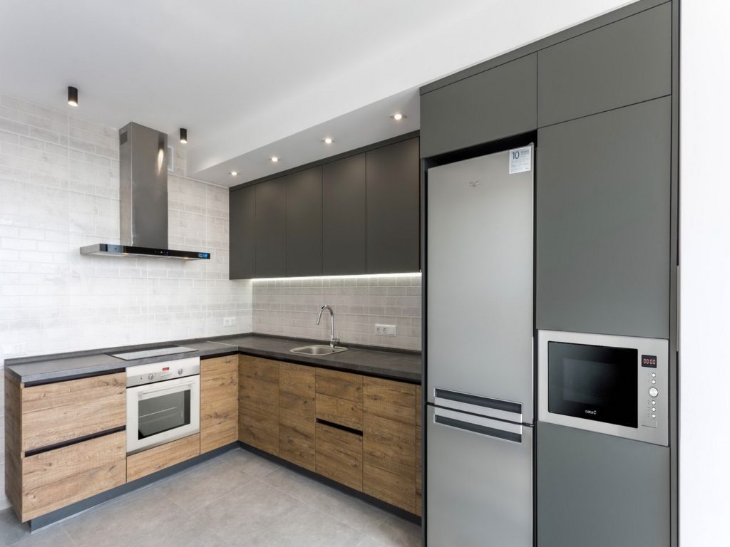Здесь важно не ошибиться в размерах. Газовую плиту и холодильник не вписывают в модульные секции, а устанавливают отдельно