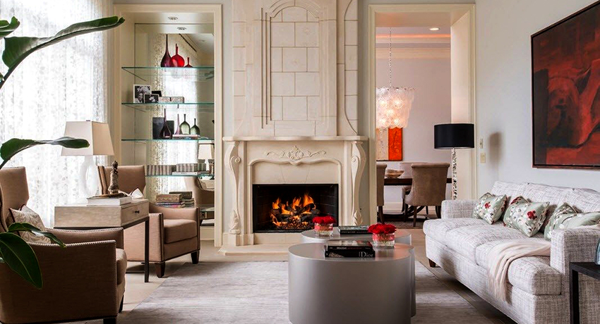 Настенные полки в интерьере гостиной с камином