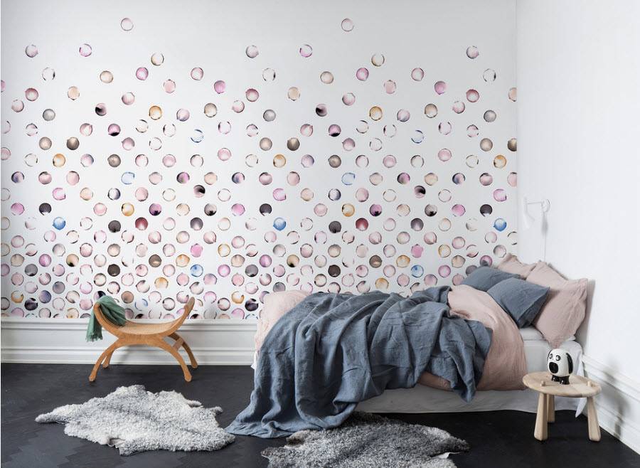 Зону прикроватной тумбочки можно выделить узорными обоями, фотообоями большого формата. Чтобы выделить такие зоны, как туалетный столик или шкаф, просто купите обои с рисунком, которые соответствуют тону основного цвета. Это позволит создать целостный вид комнаты, разделив ее на зоны.