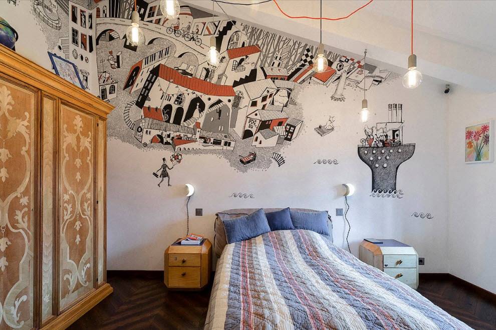 Динамичный модный интерьер в спальне ребенка создают яркие детали с воздушными шарами на обоях, которые идеально вписались в общую задумку дизайна поп-арт.
