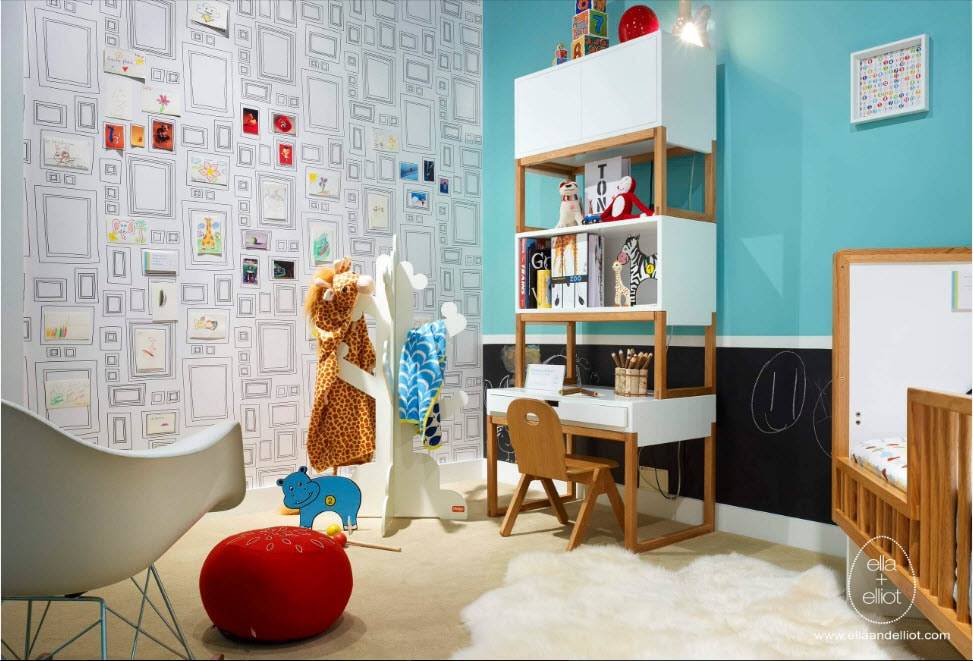рабочее место ребенка желтыми обоями, пространство над кроватью синими, а игровую область зелеными