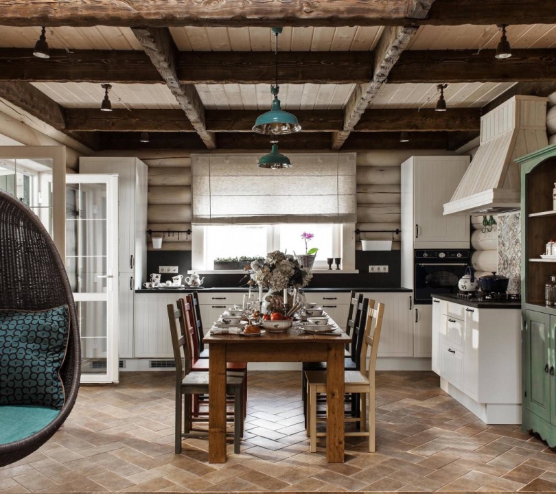 Бревенчатые светлые декорации и новая мебель, изготовленная в старинном дизайне, создают атмосферу былой эпохи с новаторским акцентом, и все благодаря подсветке, плитке и столу.