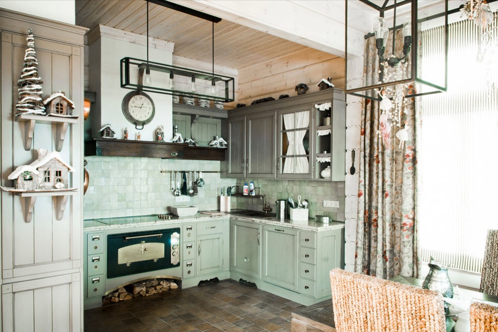 Приятный зеленый оттенок кухни в стиле кантри – визитная карточка этого интерьерного дизайна. Древесные фактуры, мягкий рассеянный свет и невысокий кухонный остров создают атмосферу максимальной наполненности домашним уютом и комфортом.