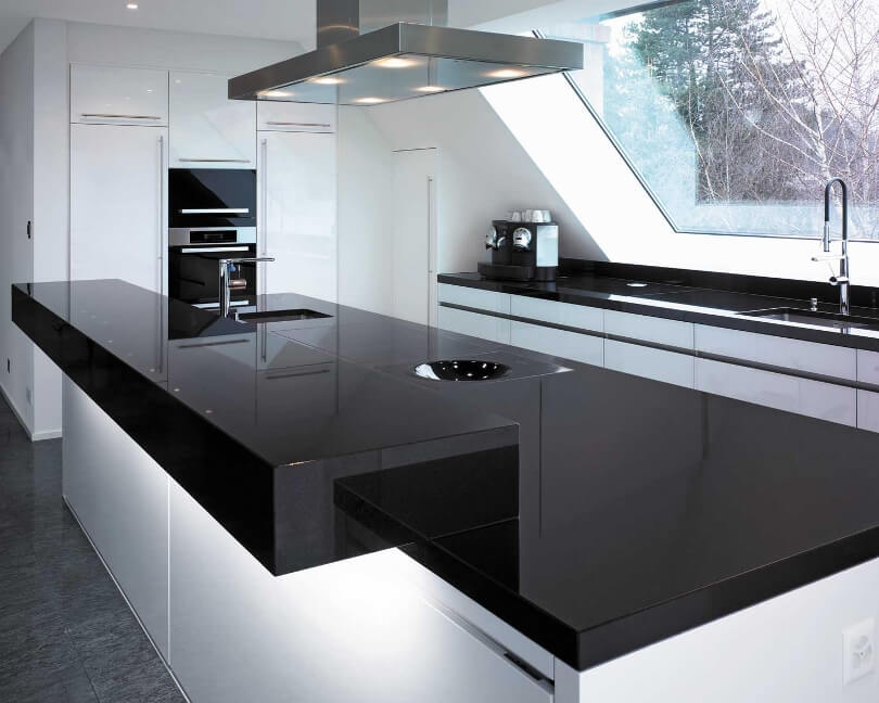 Стиль минимализм в интерьере большой кухни. Рабочая зона обозначена серым.
