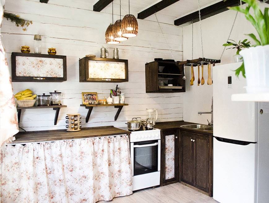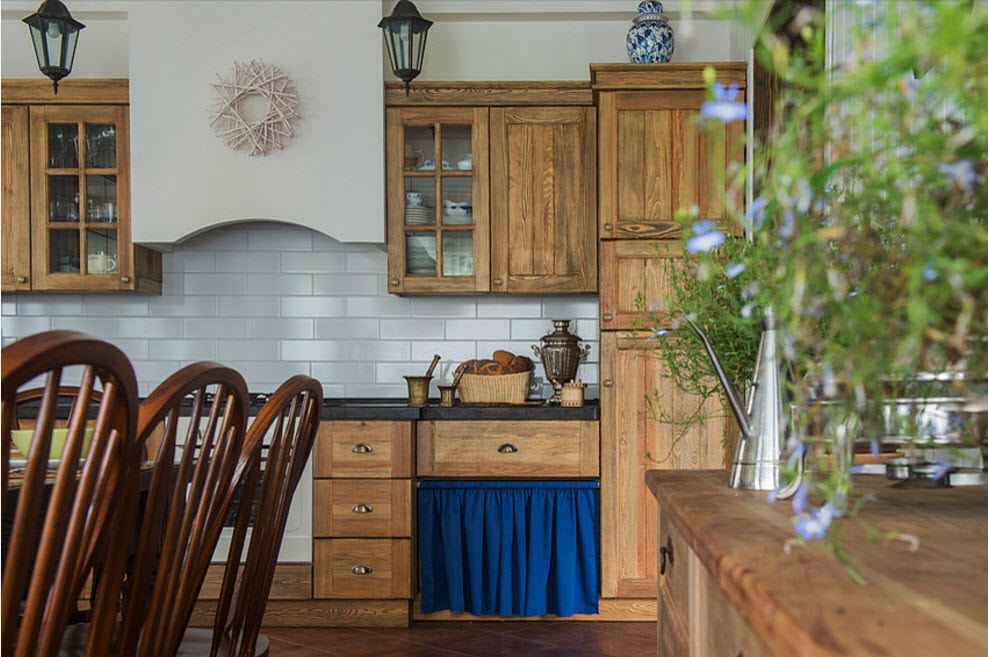 Их дополняют резными деталями и коваными элементами, что придает кухне необходимый деревенский колорит, гарнитуром с открытыми полками, на которые можно разместить керамические аксессуары, горшки с цветами.