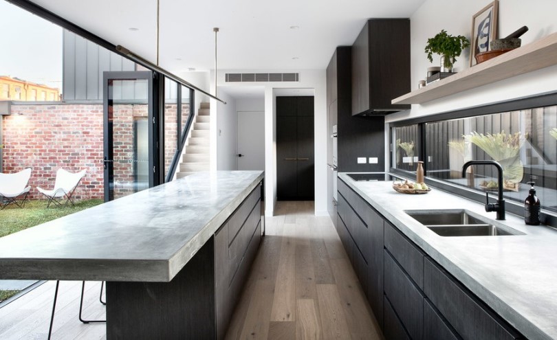 Узкое строение помещения заставляет хозяев частного дома присмотреться к интерьерам в современном стиле. Минимализм можно разбавить яркими акцентами. Неперегруженное декором пространство дает ощущение свежести и уюта. Окна в данной конфигурации кухни максимально вовлекается в интерьер за счет штор или витражных стекол.