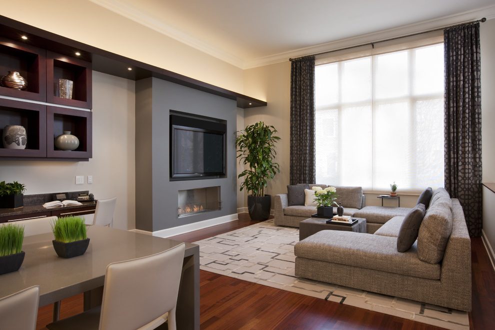 В гостиной вместо большой тумбы для телевизора можно сделать нишу, которая заметно увеличит пространство в комнате. За нишей из такого материала, в отличие от деревянной, не требуется особого ухода. К тому же она смотрится компактно.