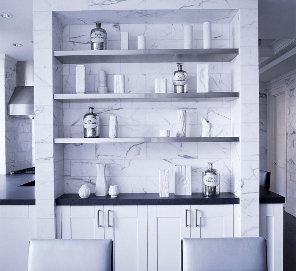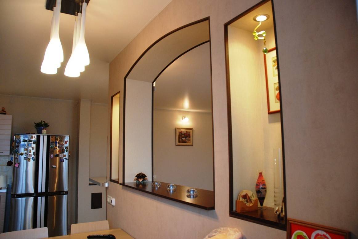 Интересным и оригинальным вариантом считается создание полок из ГКЛ в стене, которая разделяет кухню и столовую. Там они смотрятся гармонично и поэтому будут уместны.