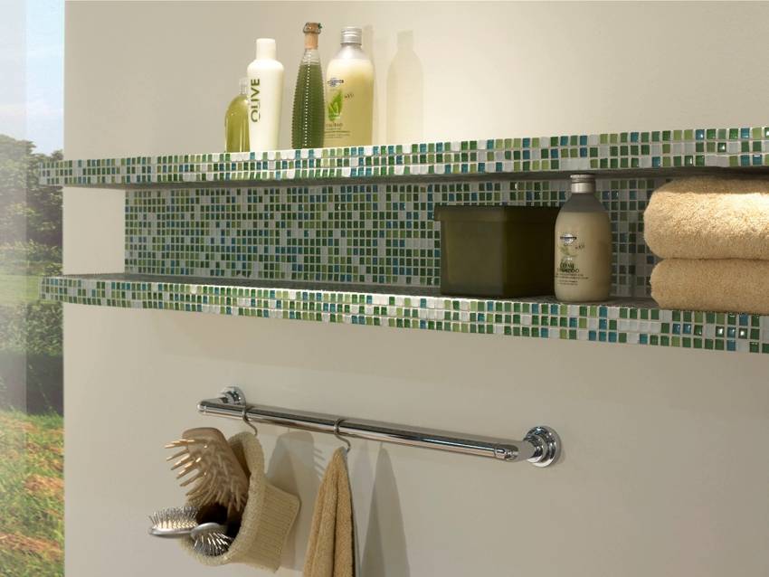 Эффектно смотрятся поверхности, отделанные мозаикой из стекла. Полки, отделанные зеркальными пазлами станут изящным украшением помещения, способствуя зрительному расширению пространства. Сальтовая мозаика в виде непрозрачного стекла обладает особым свойством преломлять свет. Благодаря такой отделке полочка в ванной из плитки может стать акцентным элементом помещения.
