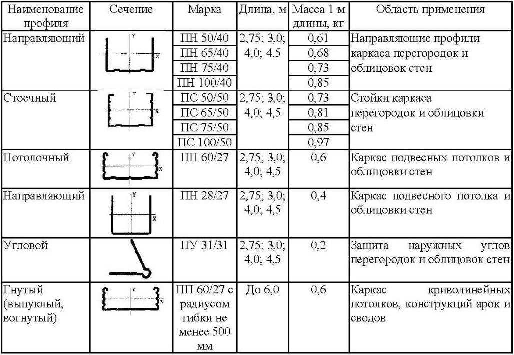 Размеры стоечного и направляющего профилей должны соответствовать друг другу