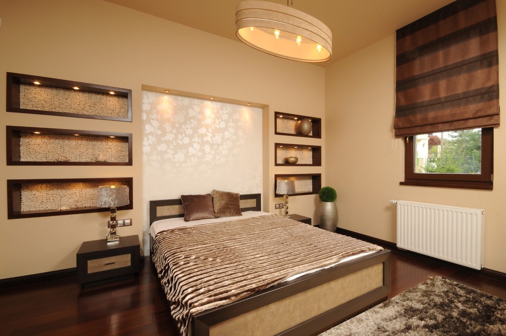 Сейчас популярно использовать полки в спальне вместо прикроватных тумбочек. Такие гипсокартонные полочки можно разместить как над кроватью, так и сбоку от нее. Декорировать их можно разными способами, ориентируясь при этом на общий дизайн комнаты. Здесь будут уместны семейные фотографии, портреты, сувениры, декоративные вазы и цветы.