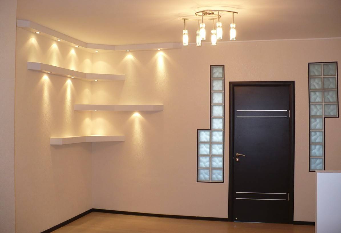 Красиво и стильно смотрятся ниши и полки в прихожей и коридоре. Например, если в нишу встроить подсветку, это поможет сильно увеличить пространство. За счет подсветки можно значительно расширить узкий коридор или малогабаритную прихожую. Полки в этом случае подбирают не слишком глубокие.