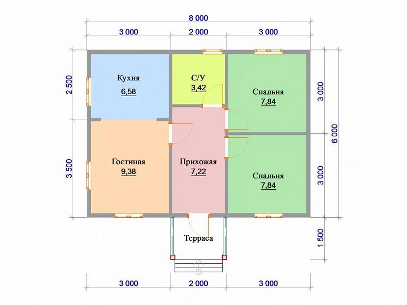 Планировка дома 6 на 8 в плане как раз может удовлетворить таким потребностям. При этом необходимо учитывать, что капитальные стены имеют какую-то толщину, и если это размеры по осям здания, то фактический размер планировки будет меньше. Например, если стены выполнены кладкой «пирог» с пенопластовым утеплителем и имеют толщину 640-650 мм, то толщина облицовки с утеплителем в данном случае будет 260-270 мм (с учётом воздушного зазора между облицовкой и пенопластом), а несущая часть стены при этом составит 380 мм, с учётом этого также проектируется и фундамент. Соответственно, размеры помещения будут меньше линейных размеров по осям на 380 мм, а с учётом штукатурки — и на все 420, то есть на 42 см.