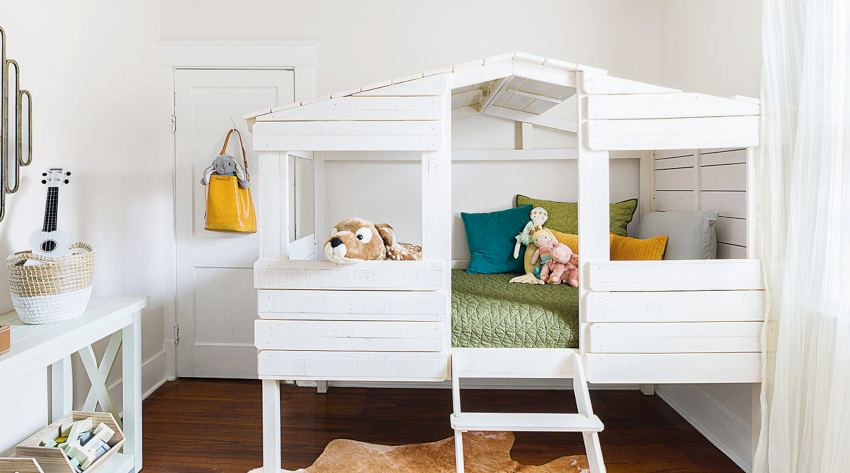 В детской зоне уместными будут фантазийные, красочные элементы. Девочкам понравится стилизованная мебель в виде дворца, кукольного театра, леса, всевозможные качели, гамаки, домики; мальчики же будут в восторге от машинок, космических и пиратских кораблей, спортивных лесенок, турников, подвесных колец. Если детей несколько, стоит постараться обустроить личный уголок для каждого. В условиях экономии площади для этого сгодятся двухъярусные, раскладные, выдвижные и трансформирующиеся конструкции.